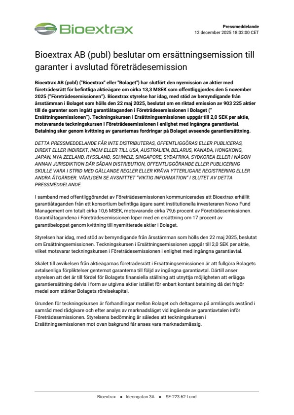 Bioextrax AB (publ) (“Bioextrax” eller “Bolaget”) har slutfört den nyemission av aktier med företrädesrätt för befintliga aktieägare om cirka 13,3 MSEK som offentliggjordes den 5 november 2025 (”Företrädesemissionen”). Bioextrax styrelse har idag, med stöd av bemyndigande från årsstämman i Bolaget som hölls den 22 maj 2025, beslutat om en riktad emission av 903 225 aktier till de garanter som ingått garantiåtaganden i Företrädesemissionen i Bolaget (”Ersättningsemissionen”). Teckningskursen i Ersättningsemissionen uppgår till 2,0 SEK per aktie, motsvarande teckningskursen i Företrädesemissionen i enlighet med ingångna garantiavtal. Betalning sker genom kvittning av garanternas fordringar på Bolaget avseende garantiersättning.