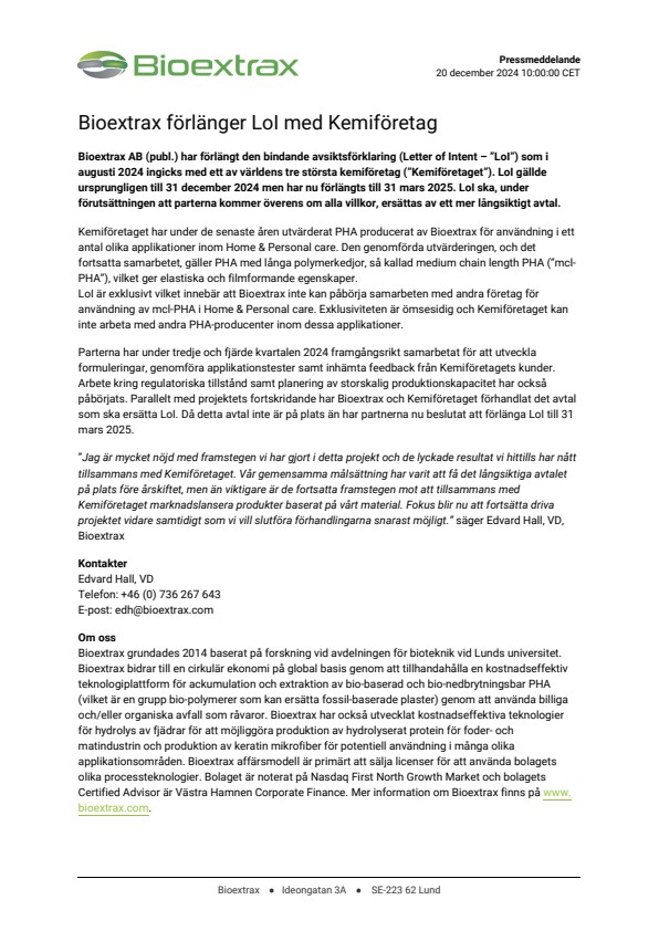 Bioextrax AB (publ.) har förlängt den bindande avsiktsförklaring (Letter of Intent – ”LoI”) som i augusti 2024 ingicks med ett av världens tre största kemiföretag (”Kemiföretaget”). LoI gällde ursprungligen till 31 december 2024 men har nu förlängts till 31 mars 2025. LoI ska, under förutsättningen att parterna kommer överens om alla villkor, ersättas av ett mer långsiktigt avtal.