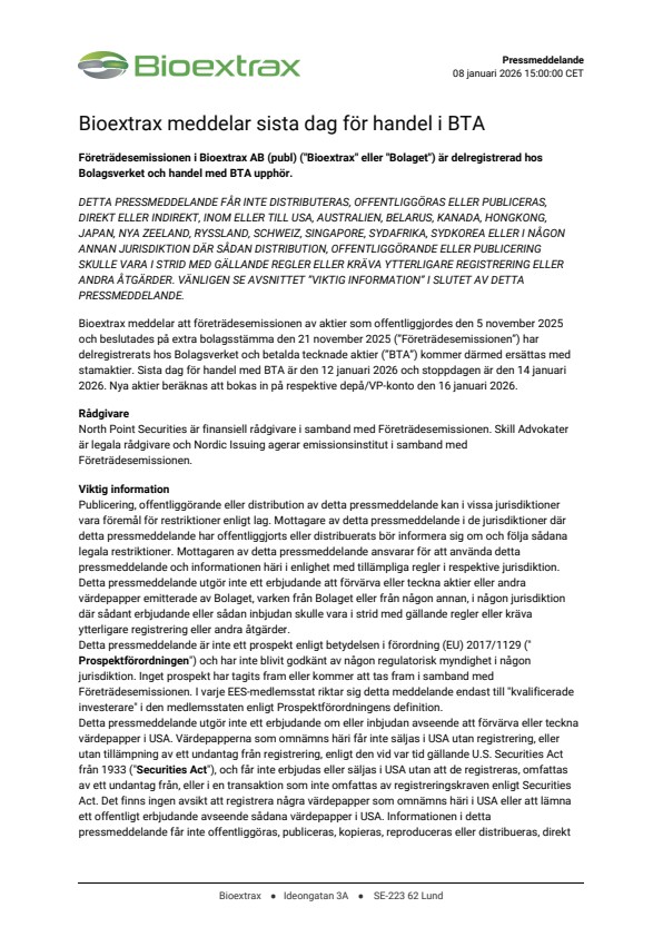 Bioextrax meddelar att företrädesemissionen av aktier som offentliggjordes den 5 november 2025 och beslutades på extra bolagsstämma den 21 november 2025 (”Företrädesemissionen”) har delregistrerats hos Bolagsverket och betalda tecknade aktier (”BTA”) kommer därmed ersättas med stamaktier. Sista dag för handel med BTA är den 12 januari 2026 och stoppdagen är den 14 januari 2026. Nya aktier beräknas att bokas in på respektive depå/VP-konto den 16 januari 2026.