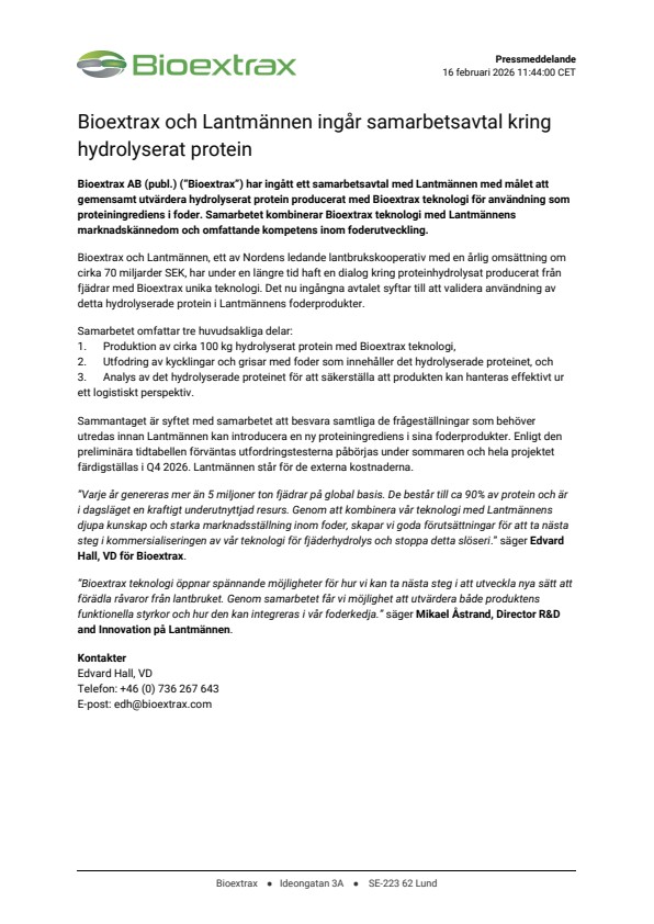 Bioextrax AB (publ.) (”Bioextrax”) har ingått ett samarbetsavtal med Lantmännen med målet att gemensamt utvärdera hydrolyserat protein producerat med Bioextrax teknologi för användning som proteiningrediens i foder. Samarbetet kombinerar Bioextrax teknologi med Lantmännens marknadskännedom och omfattande kompetens inom foderutveckling.
