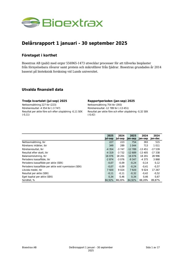 Bioextrax AB (publ.) (“Bioextrax”) offentliggör härmed delårsrapport för 1 januari – 30 september 2025. Delårsrapporten finns tillgänglig som bifogat dokument samt på bolagets hemsida (www.bioextrax.com).