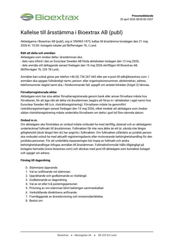 Aktieägarna i Bioextrax AB (publ), org.nr 556965-1473, kallas till årsstämma torsdagen den 21 maj 2026 kl. 10:30 i bolagets lokaler på Skiffervägen 76, i Lund.
