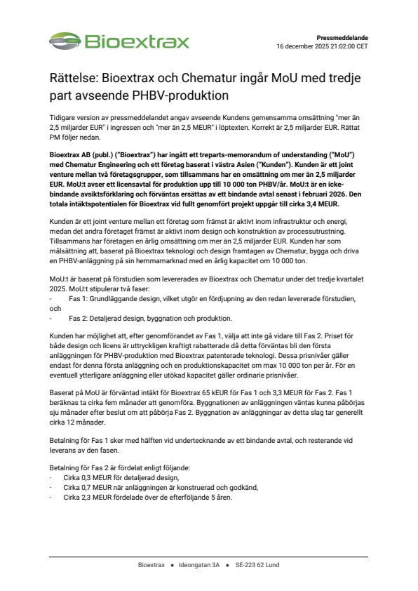 Bioextrax AB (publ.) (”Bioextrax”) har ingått ett treparts-memorandum of understanding (”MoU”) med Chematur Engineering och ett företag baserat i västra Asien (”Kunden”). Kunden är ett joint venture mellan två företagsgrupper, som tillsammans har en omsättning om mer än 2,5 miljarder EUR. MoU:t avser ett licensavtal för produktion upp till 10 000 ton PHBV/år. MoU:t är en icke-bindande avsiktsförklaring och förväntas ersättas av ett bindande avtal senast i februari 2026. Den totala intäktspotentialen för Bioextrax vid fullt genomfört projekt uppgår till cirka 3,4 MEUR.