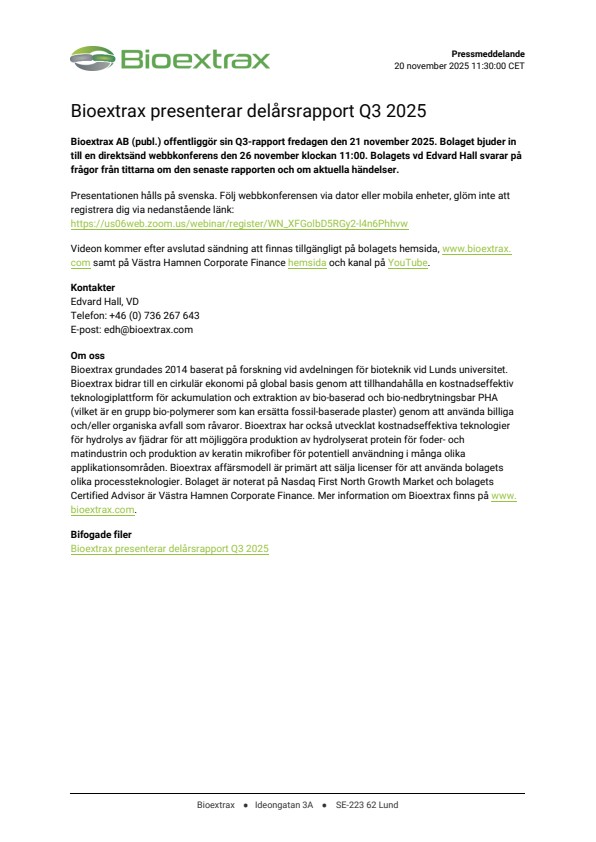Bioextrax AB (publ.) offentliggör sin Q3-rapport fredagen den 21 november 2025. Bolaget bjuder in till en direktsänd webbkonferens den 26 november klockan 11:00. Bolagets vd Edvard Hall svarar på frågor från tittarna om den senaste rapporten och om aktuella händelser.